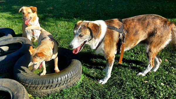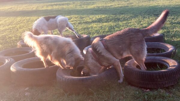 Anschließend fuhr Conny mit Fio, Flora und Grisu zum Hundeplatz, die sich ebenfalls sehr freuten, einen Ausflug zu machen. Conny legte ihnen Leckerchen aus, die sie gemeinsam suchten, dann flitzten sie wieder über die Fläche oder turnten über die Geräte, bis Conny sie schließlich zurück ins TierHeim fuhr. 🙂