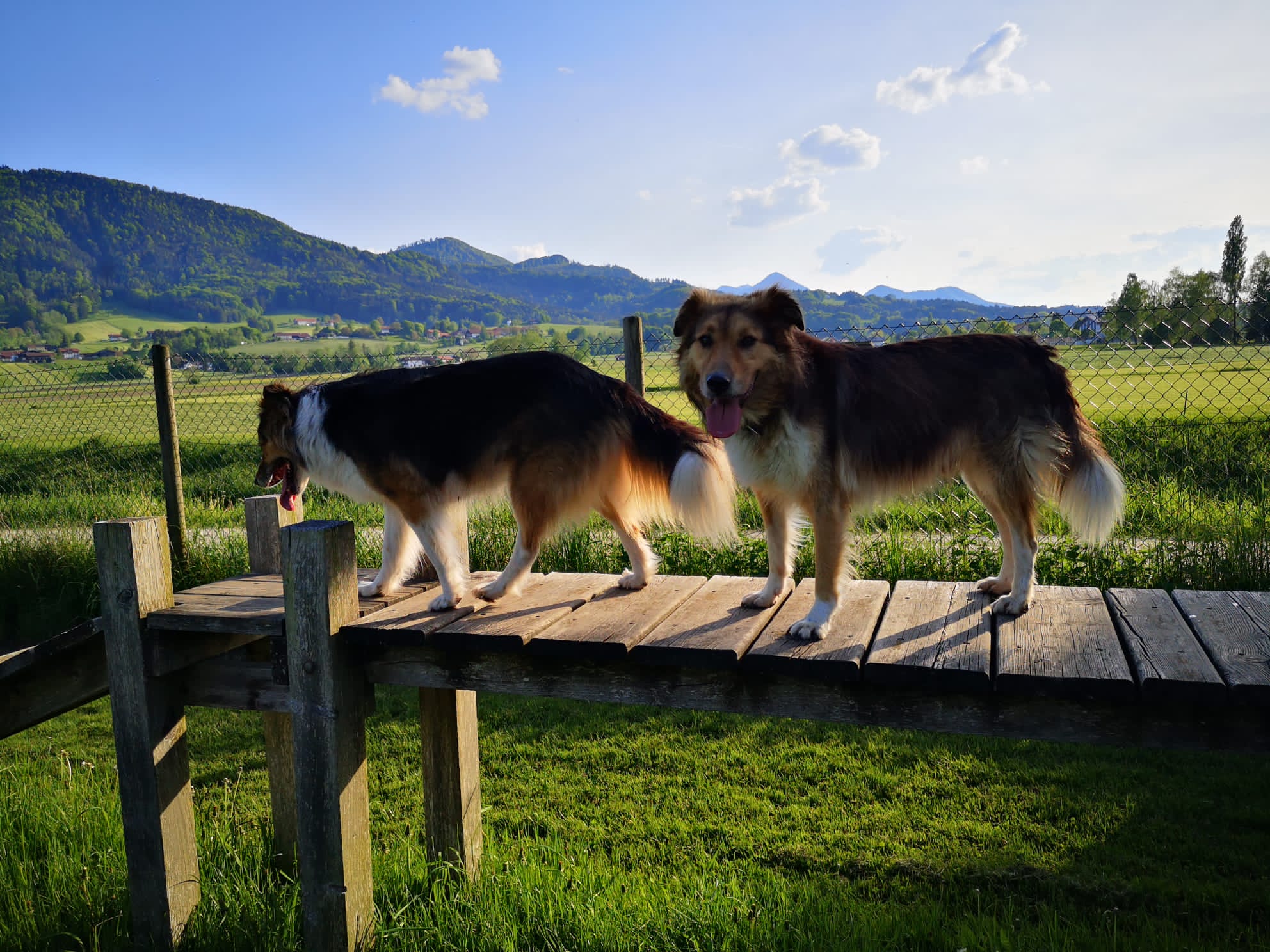 Als Rosalie und Diego abends im Hof waren, übte Karin wieder das Einsteigen ins Auto mit ihnen. Beide sprangen gut rein und blieben auch lange drinnen. So konnte Karin die Schiebetür schließen und fuhr mit ihnen zum Hundeplatz. Dort schnupperten sie neugierig über den Platz, legten sich entspannt auf die Schattenplätze zum Ruhen, erkundeten die Geräte und stiegen danach auch wieder relativ gut ins Auto ein. Diego sprang sofort rein, Rosalie ließ sich etwas bitten, aber schließlich sprang auch sie zu Diego ins Auto, obwohl gerade eine Gruppe Mensch mit ihrem Labrador am Zaun vorbei ging. Die Fahrt selbst war sehr entspannt. 🙂