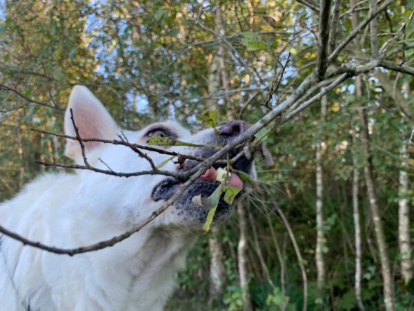 Auch Percy war auf der großen Wiese unterwegs. Em ging am Abend mit ihm vom Auslauf aus los, er kam gut mit ihr mit. Auf der Wiese schnupperte er eifrig den Spuren von Rosalie und Diego nach und kruschtelte im Gebüsch, ohne dass Em ihn mit Leckerlies dazu motivieren mußte, richtig toll! 🙂 Nachdem sie gut gelaunt um die komplette Wiese gelaufen waren, machten sie sich entspannt auf den Rückweg, wo Nicky und Laluna die beiden fröhlich begrüßten.
