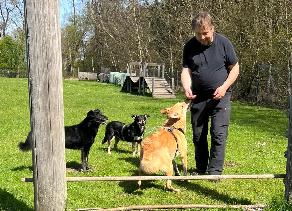 Ben ging mit Rosalie und Diego auf die große Wiese, wo die beiden immer in seiner Nähe blieben. Während einer Pause setzten sie sich neben Ben und genossen die Streicheleinheiten von ihm. Nach zwei entspannten Runden um die Wiese warteten sie kurz ab, bis keine Fahrradfahrer mehr vorbei fuhren und gingen dann fröhlich zurück ins TierHeim. 🙂
