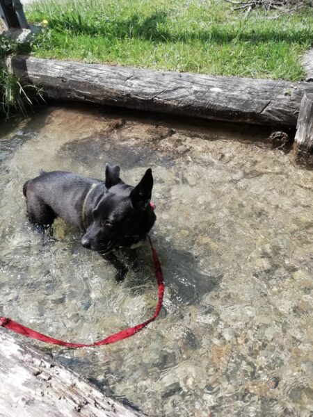 Giselle freute sich sehr, als Conny sie wieder zu einem Ausflug in den Kurpark abholte. Gleich nach dem Aussteigen schnüffelte Giselle den vielen Spuren nach, wälzte sich begeistert, setzte sich ins Gras und beobachtete die Umgebung. Es war sehr ruhig, nur Vogelgezwitscher war zu hören. Am Bach angekommen steuerte Giselle direkt das Wasser an, lief dort ein Stückchen und entdeckte dabei zwei Hunde, die sie sehr genau anschaute. Alles super entspannt. Dann setzte sie sich am Rand in die schattige Wiese, legte sich schließlich hin und ließ sich den kühlenden Wind um die Nase wehen. Conny setzte sich dazu, es war ein schöner Ausflug für beide. 🙂