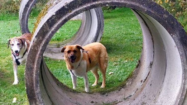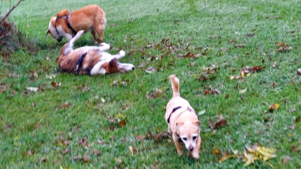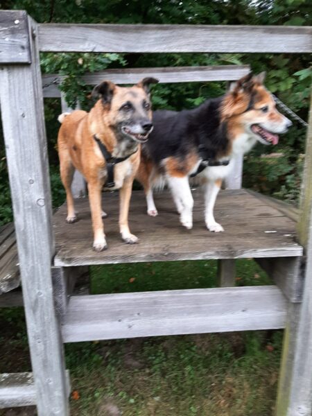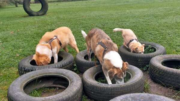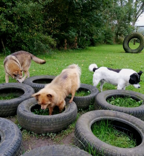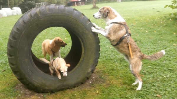 Conny war mit Lena, Angel und Bonnie auf dem Hundeplatz, wo alle drei ausgelassen herumsausen, die Geräte erkundeten und bei den Reifen gemeinsam die Leckerchen einsammelten, die Conny für sie ausgelegt hatte. Es war ein schöner Ausflug. 🙂