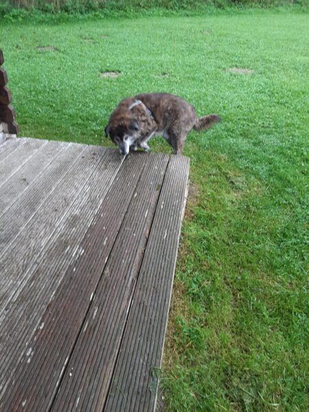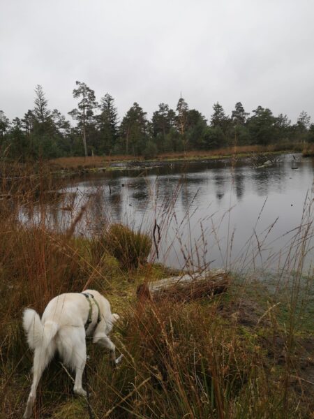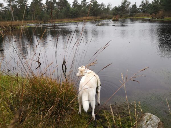 Karin fuhr mit Santana mit ihrem Auto zur großen Wiese und ging dort mit ihm spazieren. Die beiden liefen auch zum kleinen See, wo Santana auf interessanen Spuren unterwegs war, schon beinahe meditativ das Wasser beobachtete und sich über Leckerliesuchen freute. 🙂