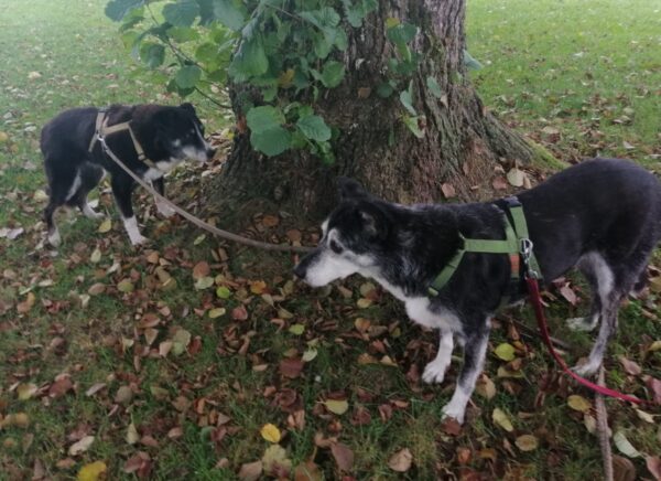 Etwas später arbeiteten Chris und Lukas an der Vergesellschaftung von Santana mit Kaya. Santana wollte gerne kontakten, Kaya war er zu stürmisch, sie forderte zwei Mal freundlich, aber bestimmt etwas Distanz, was Santana anstandslos akzeptierte. So liefen die beiden ruhig nebeneinander her und schnüffelten herum – ein guter Anfang! 🙂