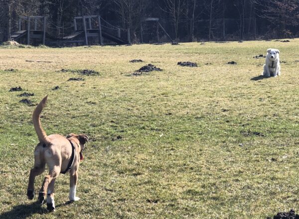 Mit Josh ging Em auf die Wiese rechts gegenüber vom TierHeim. Fröhlich lief Josh mit, aber die Radfahrer irritierten ihn deutlich. Auf der Wiese war er entspannter. Em versteckte ihm ein paar Leckerchen an den Baumstämmen, die er eifrig suchte. 🙂