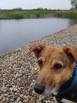 Kaya begrüßte Dagmar freudig im Hof und lief geschwind mit ihr vor zum Tor. Unterwegs schnupperte sie den Spuren von Lucky und Balto nach und freute sich über eine kleine Leckerlie- und Kuschelpause bei den Weihern. Nach plantschen war ihr heute nicht, da es ohnehin nieselte und ihr das Wasser von oben offensichtlich schon reichte. Zufrieden machten sich die beiden auf den Rückweg. 🙂