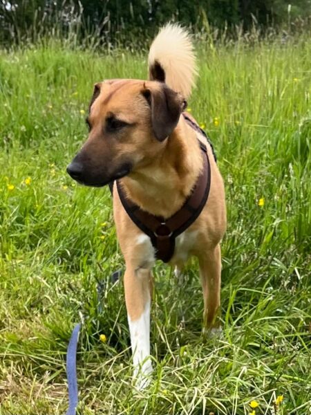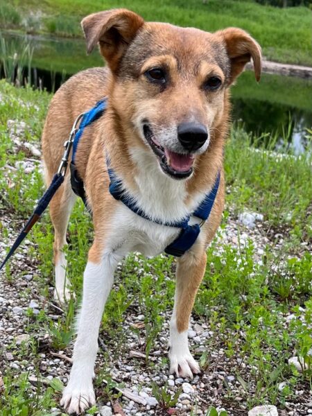 Mit Sam ging Evi über die Wiesen rund ums TierHeim. Sam hatte viel Spaß beim ausgiebigen Schnüffeln, genoss entspannte Kuschelpausen mit Evi und wälzte sich immer wieder übermütig im Gras. 🙂