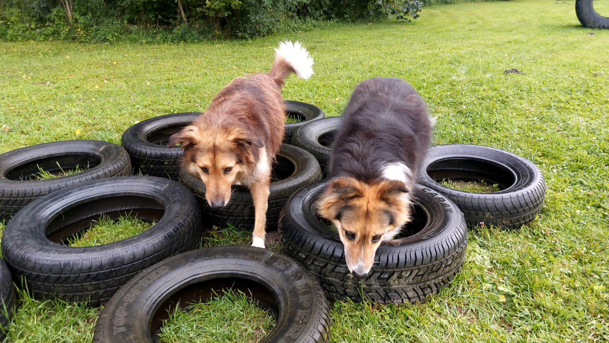 Conny fuhr mit Rosalie und Diego zum Hundeplatz. Sie liefen fröhlich durch das nasse Gras und suchten nach Leckerchen in den Reifen, die Conny unbemerkt versteckt hatte. Diego ließ sich sogar von Conny streicheln, was sie sehr freute. 🙂