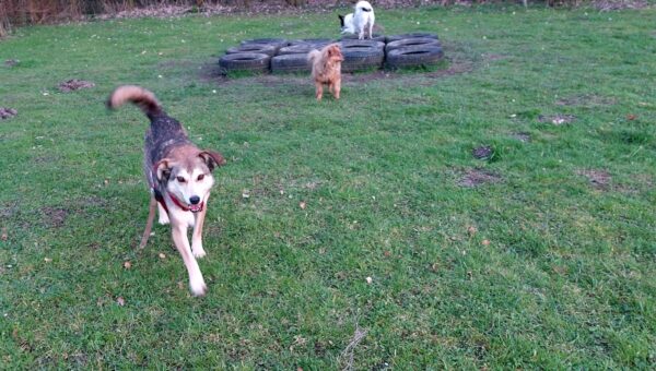 Auch Flora, Fio und Grisu freuten sich über einen Ausflug mit Conny zum Hundeplatz. Sie sausten fröhlich kreuz und quer über die Fläche – und auch Grisu, der gestern nach der Blasrohrimpfung lahmte, lief heute wieder munter herum. Fio kam immer wieder zum Streicheln zu Conny, mit Flora und Grisu machte sie kleine Tricks und alle vier hatten viel Spaß. Dann wurde es stürmisch und als eine heftige Windböe die Styroporstufen-Einstiegshilfe vor dem TierHeimauto herumwirbelte, erschracken die Hunde für einen Moment, aber gleich darauf liefen sie wieder unbeschwert über´s Gelände. 🙂