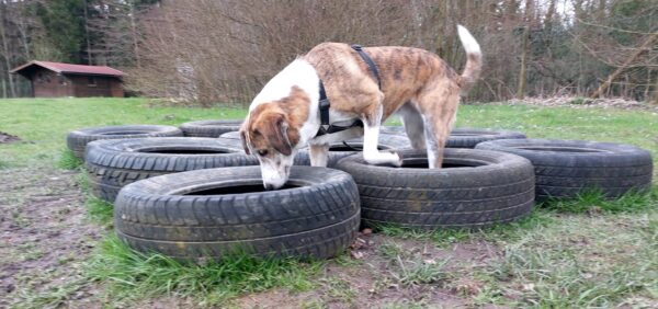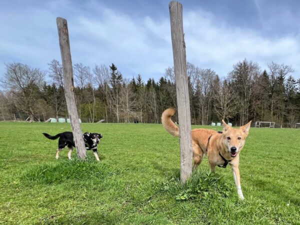 Mit Lena fuhr Conny zum Hundeplatz. Sie wälzte sich schon fröhlich brummelnd im Auto und schnüffelte ausgiebig den vielen Spuren der Hundegruppe nach, die vorher da war. Mit zwei Radfahrern rannte sie am Zaun entlang und legte sich dann bei den Reifen ab, um auf Conny (und die Leckerliesuche 🙂 ) zu warten. Lachend rannte sie über den Platz und von einem Gerät zum nächsten. Mit einem schwarzen Pudel flitzte sie am Zaun entlang, nur die dazugehörigen Menschen verbellte sie. Immer wieder sauste sie zu Conny und ließ sich gerne streicheln. 🙂