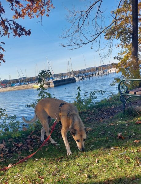 Mit Sam war Chris auf der großen Wiese und am See dahinter. Sam lief brav mit, freute sich über eine Leckerliesuche und fand den Ausflug zum kleinen See hinter der Wiese richtig spannend. 🙂