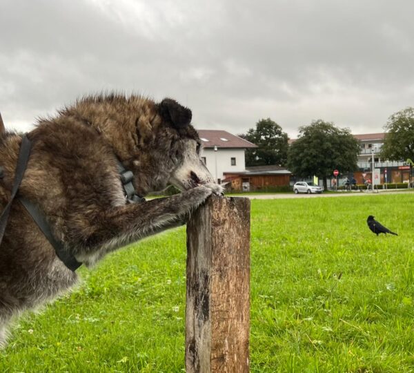 Em und Elfriede gingen mit Lucky und Balto im Kurpark spazieren. Die beiden schnüffelten munter am Wegesrand und freuten sich über eine Leckerliesuche, wobei sie von der Krähe beobachtet wurden, die sie so oft begleitet. Als es stärker zu regnen begann, suchten sie unter den großen Bäumen etwas Schutz, aber der Regen wollte nicht mehr aufhören und so machten sich die vier tapfer auf den Rückweg und kamen nass, aber zufrieden zurück ins TierHeim. 🙂