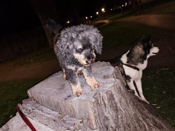 Conny war mit Percy, Nicky und Laluna auf dem Hundeplatz, wo die drei fröhlich herumsausten. Percy und Nicky kommentierten ab und an vorbei kommende Spaziergänger, während Laluna bei Conny blieb und lieber mit ihr kuschelte. Bei der Gerätearbeit mit Leckerchenbelohnung kamen alle drei wieder zusammen. 🙂