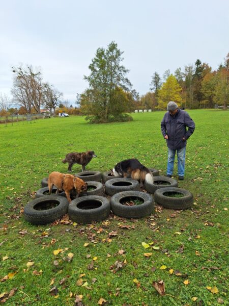 Danach fuhren Dagmar und Fred mit Lucky, Balto und Rosalie zum Hundeplatz, wo alle viel Spaß hatten. Die Hunde kletterten über die Geräte, sausten über die Fläche und freuten sich über Leckerchen. Zeit zum Kuscheln war auch und so war es ein toller Ausflug für alle. 🙂