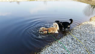 Mit Latjak und Valentina war Eva am Vormittag unterwegs. Die beiden waren hellauf begeistert als es los ging. Latjak ist längst nicht mehr so unsicher unterwegs, wie er es anfangs war, mittlerweile sucht er bei den Spaziergängen auch nicht mehr unentwegt die Nähe von Valentina, sondern schnüffelt auch schon mal entspannt in größerer Entfernung von ihr. Richtig klasse! Auf dem Weg kamen die drei an einem Weiher vorbei, in dem Valentina erstmal ein Bad nahm und Latjak sich die Füße kühlte. 🙂