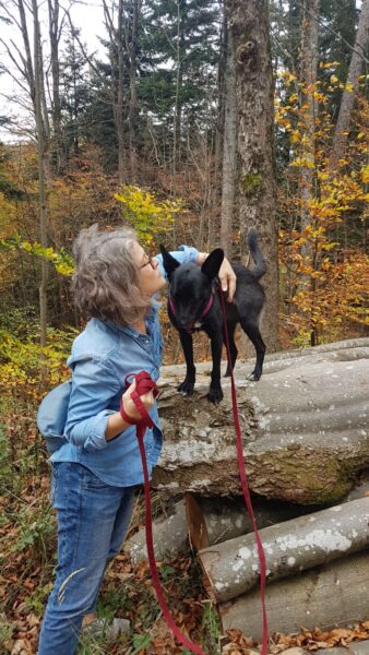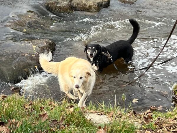 Auch Latjak und Valentina waren auf dem Rundweg zum Farbinger Hof unterwegs. Jutta und Matthias fuhren mit den beiden zur Schreinerei Mehnert und gingen von dort aus los. Alle vier hatten viel Spaß während des Ausflugs. Im Bach plantschten die beiden fröhlich im Wasser und als sie noch einen Abstecher auf den Hundeplatz machten, arbeitete Valentina mit Feuereifer an den Geräten, wofür es auch immer wieder Leckerlies gab. 🙂