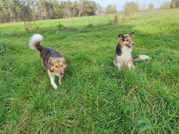 Mit Rosalie und Diego ging Alex am Nachmittag zur großen Wiese, wo die drei viel Spaß hatten. Rosalie sauste fröhlich voran, wälzte sich immer wieder im Gras und rannte wieder zu Alex und zu Diego, der lieber gemütlich am Wiesenrand die langen Grashalme beknabberte. 🙂