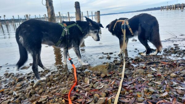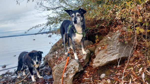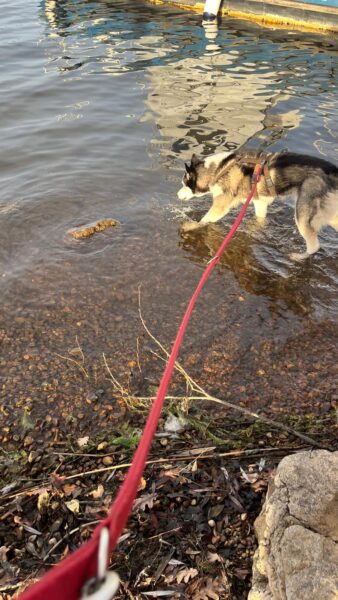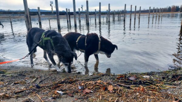 Kirana freute sich über einen langen Spaziergang mit Brigitte zum Chiemsee. Bis vor zum Medical Park liefen sie recht zügig, dann wurde Kirana ruhiger, schnüffelte gerne herum und ging zum Pritscheln ins Wasser. 🙂