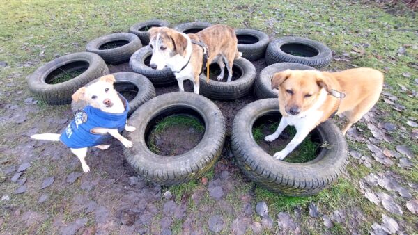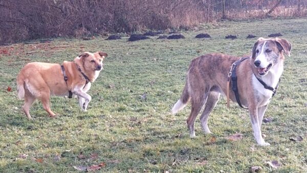 Conny fuhr mit Lena, Angel und Bonnie zum Hundeplatz. Es war ringsum viel los, aber die vier hatten trotzdem viel Spaß miteinander und genossen den Ausflug sehr. Sie schnüffelten herum, beobachteten die Gegend und sammelten die von Conny ausgelegten Leckerlies ein. 🙂