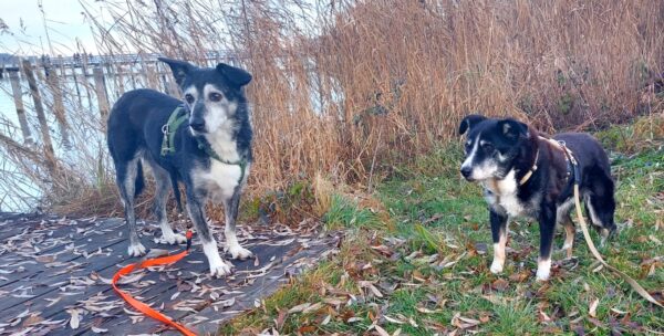 Tagespensionsgast Elfi freute sich über eine kurze Abendrunde mit Brigitte. Entspannt waren die beiden in Richtung Übersee unterwegs, als wir die Nachricht bekamen, dass Elfi nicht – wie vereinbart – abgeholt wird. Ihr Halter ist freiwillig aus dem Leben geschieden und hat sie uns zuvor anvertraut, damit sie gut versorgt ist, wenn er nicht mehr für sie da sein kann. Er hat uns mehrere ausführliche Briefe geschrieben, in denen er vor allem erklärte, was Elfi mag bzw. nicht mag, was sie am liebsten frißt, worauf man auf Spaziergängen achten sollte usw. Er hat sich wirklich sehr viel Mühe gegeben, damit Elfi nach seinem Tod gut versorgt ist…