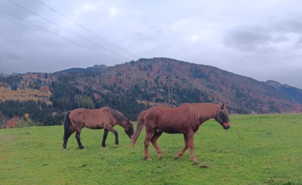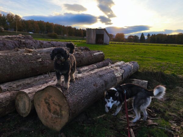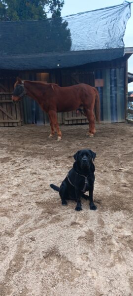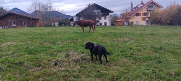 Heute war wieder Dani mit ihrem Rüden Camino im Stall. Obwohl sie sehr früh dran waren, warteten Wallace und Gowinda schon auf dem Paddock und begrüßten die beiden fröhlich wiehernd. Nach dem Frühstück, dem Striegeln und dem Hufe ausputzen, durften die beiden gleich wieder auf die Weide. Dani und Camino begleiteten sie und verbrachten noch Zeit mit ihnen. 🙂
