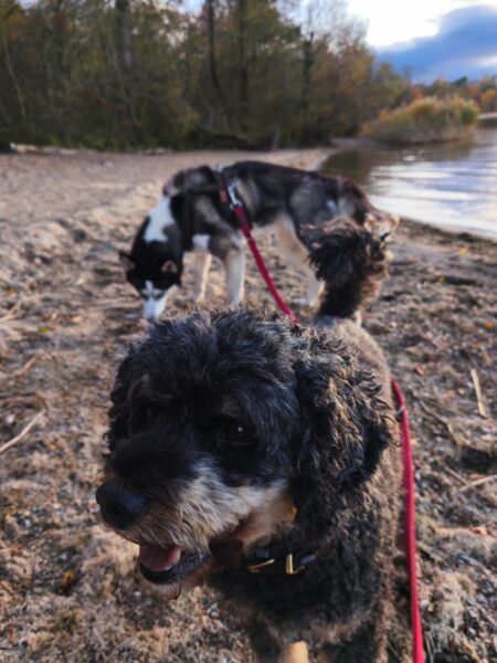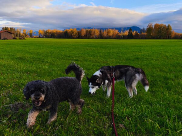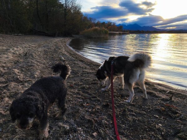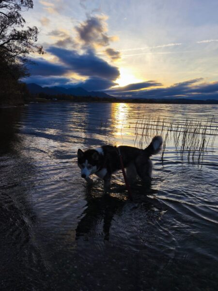 Carsten und Pablo kamen spätnachmittags und holten Kirana zu einem schönen Spaziergang zum Chiemsee ab. Die Hunde (und Carsten) hatten viel Spaß und genossen die letzten Sonnenstrahlen des Tages. Kirana und Pablo schnüffelten und erkundeten einträchtig Wege und Wiesen, Kirana ging auch ein wenig ins Wasser, danach stromerten sie entspannt am Ufer entlang und machten sich dann auf den Rückweg. 🙂