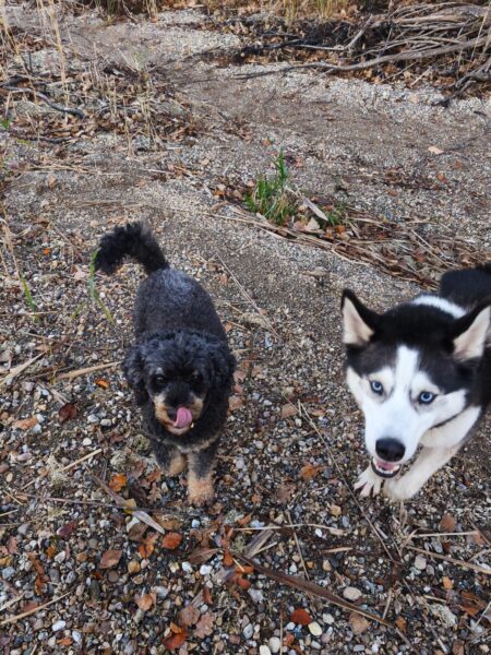 Mit Sam ging Carsten anschließend zu den Weihern beim Maler Haas. Sam war anfangs zögerlich, weil es schon dämmerte, aber mit Geduld und sanfter Überredung lief er doch entspannt weiter und fand es schließlich schön, herumzuschnüffeln, nach Leckerchen zu suchen und natürlich sich ausgiebig streicheln zu lassen. 🙂