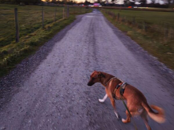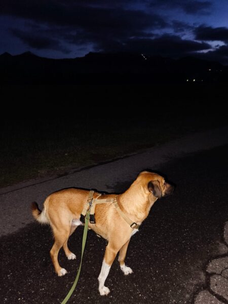 Kerstin kam abends und ging mit Santana in Richtung Bernau. Kaum waren sie beim Tor draußen, kam ein Radfahrer recht flott vorbei und Santana machte einen kleinen Satz nach vorne. Kerstin hatte ihn und die Leine aber gut im Griff und konnte die Situation gut händeln. Entspannt liefen sie weiter und Santana erkundete neugierig die vielen Spuren am Wegesrand. Am Stromhäusl kamen nochmal zwei Radfahrer, die wenig Platz für die beiden ließen, trotzdem blieb Santana relativ ruhig und Kerstin hatte auch hier alles unter Kontrolle, auch wenn sie innerlich froh war, dass Santana für seine Verhältnisse so gechillt war. 🙂 Der weitere Spaziergang war dann endlich ganz entspannt und weil die beiden so viel Freude hatten, gingen sie auf dem Rückweg am TierHeim vorbei und noch ein Stück weiter in Richtung Übersee. 🙂