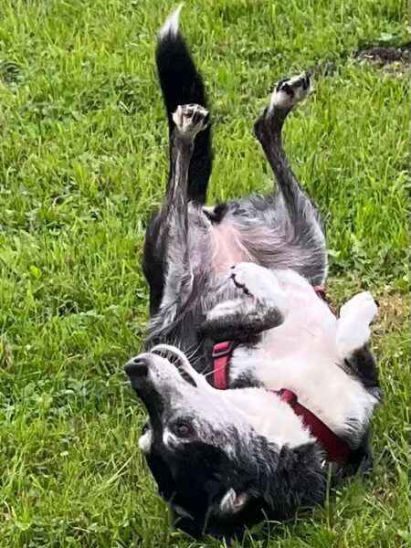 Mit Samuel ging Alex auf die große Wiese und den verwilderten Teil daneben. Es war ein schöner und entspannter Spaziergang. Samuel schnüffelte im Gras, knabberte an ein paar Halmen, suchte nach Leckerchen und forderte Alex zum Kuscheln auf. 🙂