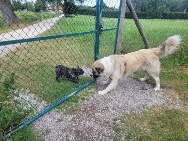 Mit Aslan fuhr David zum Hundeplatz. Aslan freute sich schon im TierHeim und wußte genau, dass es nun einen Ausflug geben wird. Auf dem Hundeplatz traf er den French Bulldog Ulli am Zaun, die beiden beschnupperten sich freundlich. Ulli bellte ubd forderte Aslan zum Spielen auf, Aslan blieb dabei freundlich, aber zurückhaltend. 🙂