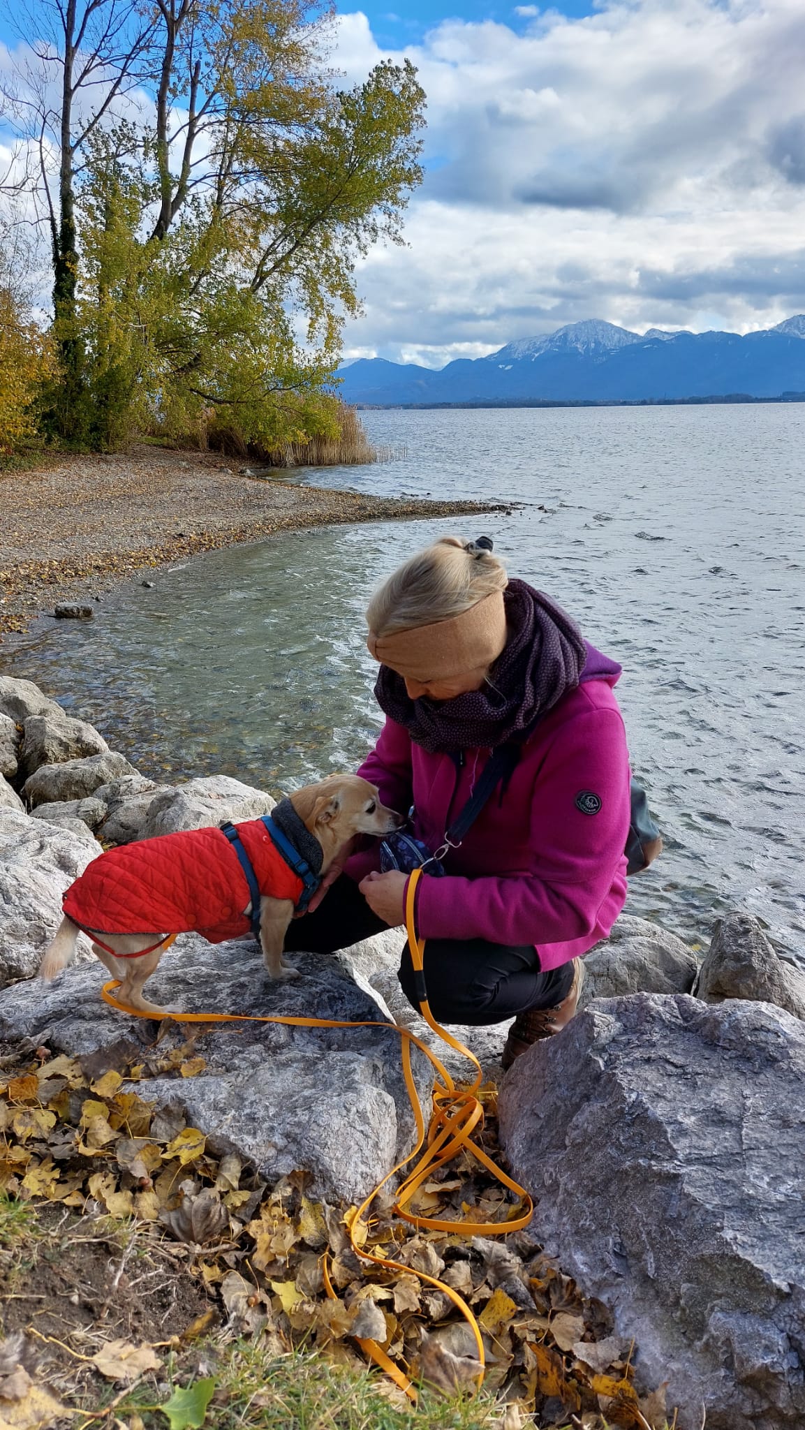 Connie nahm Bonnie mit auf einen schönen, langen Ausflug auf die Fraueninsel. Bonnie freute sich sehr über viel Gelegenheit zum Schnüffeln, Erkunden und Kuscheln. Während der Schifffahrt saß sie auf Conny`s Schoß und ließ sich den Wind um die Nase wehen. 🙂