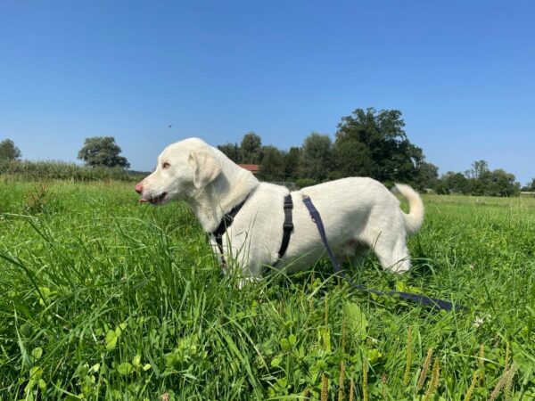Er kann schon ein Geschirr tragen und an der Leine laufen und hat bei uns innerhalb weniger Stunden gelernt, Treppen zu laufen. Er fährt gut im Auto mit, auch das selbständige Einsteigen hat er innerhalb weniger Übungsdurchgänge gelernt. Auf Spaziergängen schnüffelt er neugierig herum und beobachtet staunend seine neue Umgebung. Hier ein paar Eindrücke seiner ersten Tage bei uns: