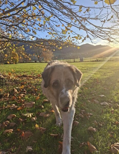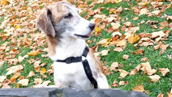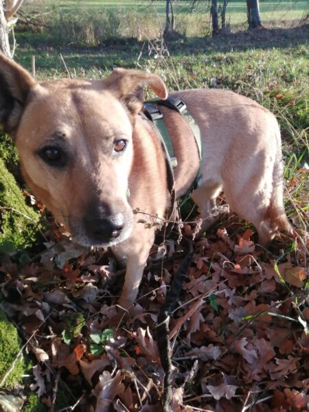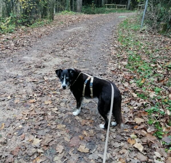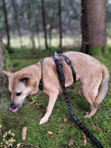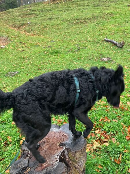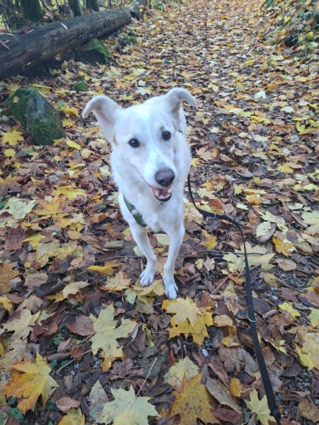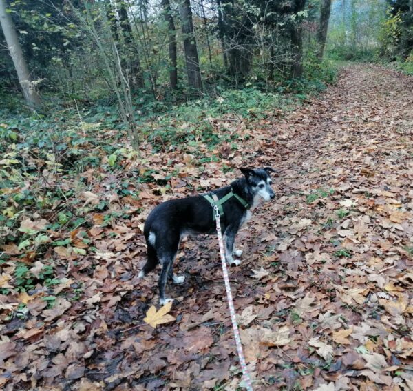 Santana freute sich riesig, als Chris mit ihm am Nachmittag zum Wasserfall fuhr. Die beiden hatten dort eine schöne Zeit, genossen den Herbstwald im Sonnenlicht und für Santana gab es jede Menge spannende Spuren zu erkunden. Zwischendurch forderte er Chris zum Kuscheln auf, indem er sich einfach fest an ihn drückte, sooo niedlich! 🙂 Wenn dann genug gekuschelt war, lief er entspannt und gut gelaunt weiter und fand zu seiner Freude auch noch das ein oder andere Leckerlie am Wegesrand, das Chris für ihn ausgelegt hatte. 🙂