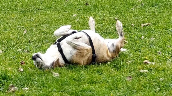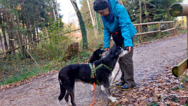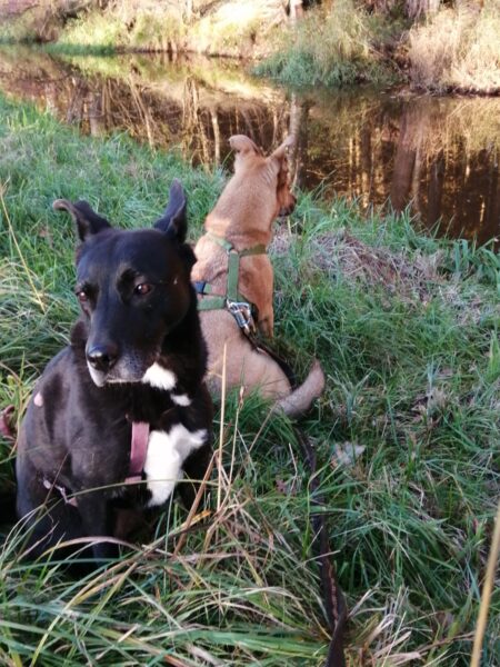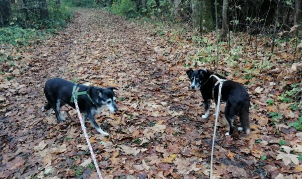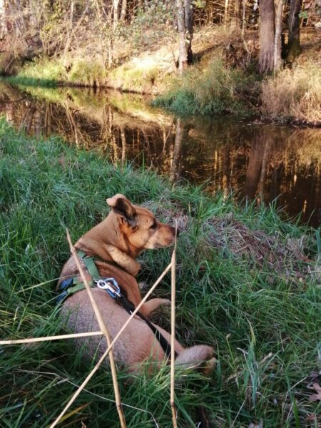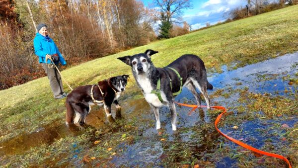 Jutta und Renate waren mit Momo und Aika auf dem Waldweg und nach einer schönen Pause am Bach gingen sie noch weiter zum See. Die Mädels wälzten sich wohlig im Gras, suchten eifrig nach Leckerchen und natürlich wurde auch viel gekuschelt. Am Seeufer genossen alle vier die letzten warmen Sonnenstrahlen, die Hunde plantschten noch mal kurz, dann machten sie sich zufrieden auf den Rückweg. 🙂