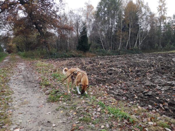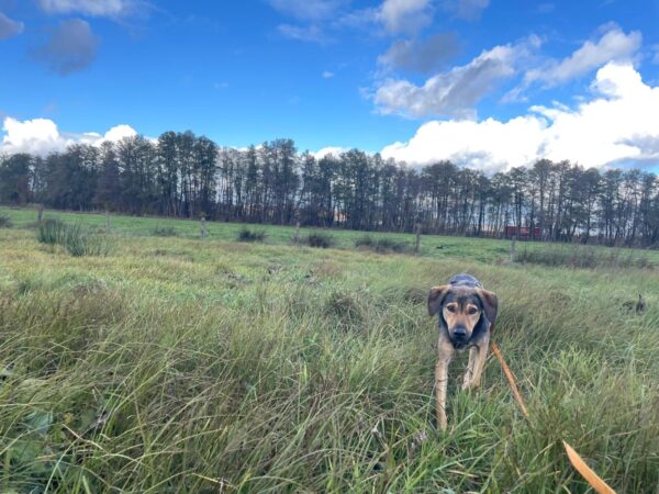 Mit Jack ging Silja auf die große Wiese. Es war einfach nur schön, Jack lief prima an der Leine und erkundete neugierig die Wiese und den Waldrand. Zwischendurch kam er immer wieder mal zu Silja, holte sich ein Leckerlie oder Streicheleinheiten ab und schnüffelte dann weiter herum. 🙂