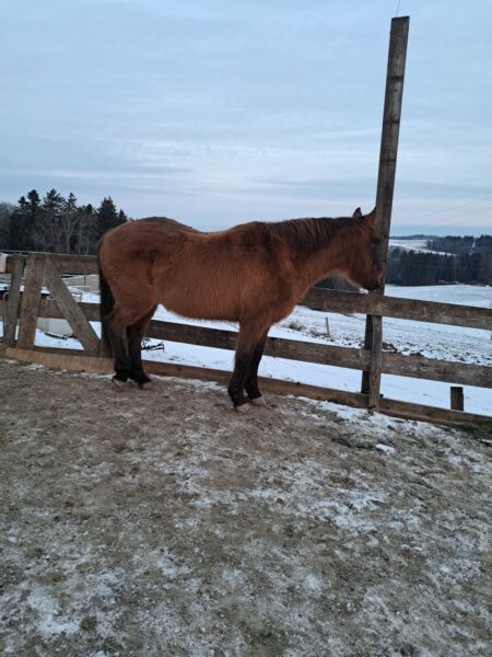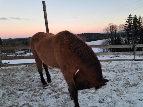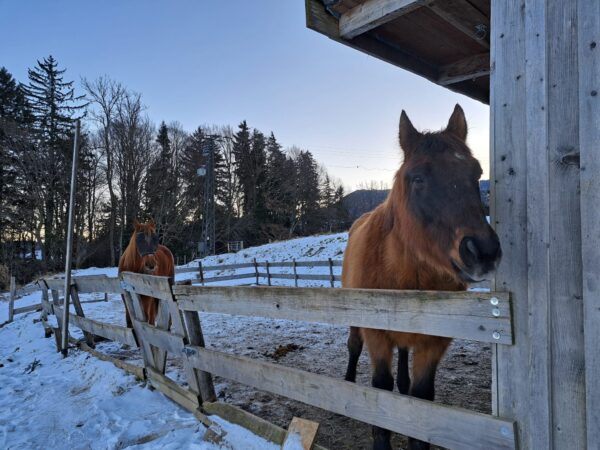 Als Biggi abends im Stall ankam, war es mit bereits -12°C saukalt. Gut, dass Wallace und Gowinda so ein gut ausgeprägtes Winterfell haben, das sie schützt. Beide freuten sich über warmes Müsli und über Streicheleinheiten von Biggi, nachdem die mit den Stallarbeiten fertig war. 🙂