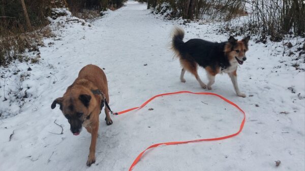 Mit Kirana holte Carsten seinen Rüden Pablo ab, dann gingen die drei die große Runde im Eichental. Die Hunde schnüffelten einträchtig am Wegesrand und über die Wiesen und freuten sich zwischendurch über Leckerlies von Carsten. Besonders niedlich war es, als Pablo auf Kirana`s Spielaufforderung einging, denn eigentlich ist er eher zurückhaltend und nicht der Spieler, aber Kirana ist ihm nun vertraut genug und so war Carsten`s Geschick beim Leinenhandling gefragt, damit die beiden fröhlich herumtollen konnten. So schöne Momente! 🙂