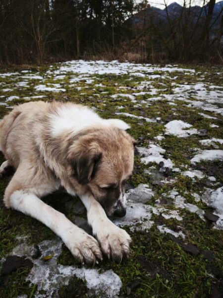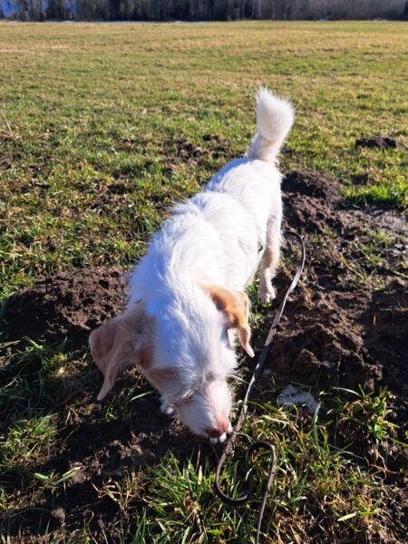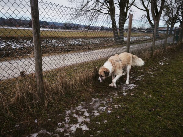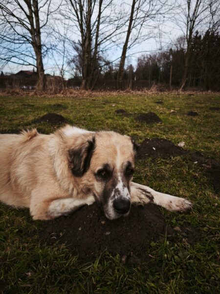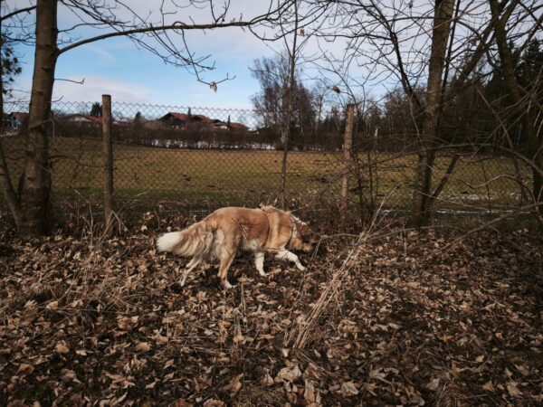 Aslan freute sich über eine gemütliche Hundeplatzrunde mit Carsten. Er stromerte munter am Zaun entlang, kontaktete mit anderen Hunden und suchte eifrig nach den von Carsten ausgelegten Leckerlies. Zum Ausruhen und Kuscheln suchte sich Aslan einen Liegeplatz mit einem Maulwurfshaufen als „Kopfkissen“, was richtig niedlich aussah. 🙂 Danach bummelten die beiden zufrieden weiter ihre Runde und Aslan beobachtete dabei aufmerksam die Umgebung. 🙂