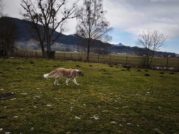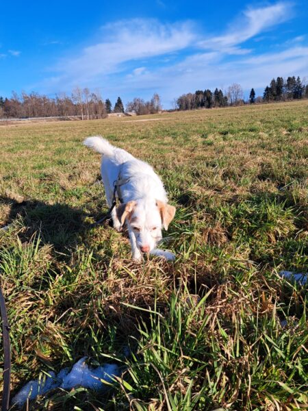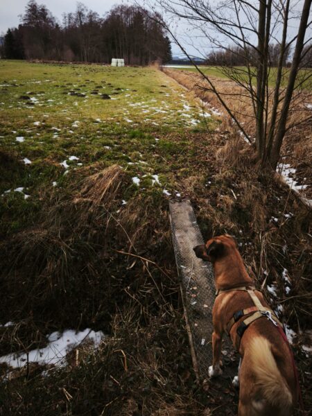 Biggi war am Nachmittag mit Elfie in Richtung Übersee unterwegs. Auf der frisch abgetauten Wiese roch es überall sehr interessant und so hatte Elfie die Nase unentwegt am Boden… und fand dabei zu ihrer großen Freude auch immer mal wieder von Biggi ausgelegte Leckerchen im Gras. 🙂