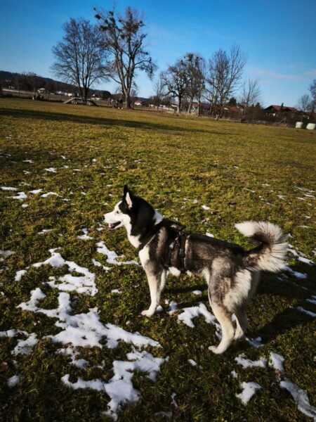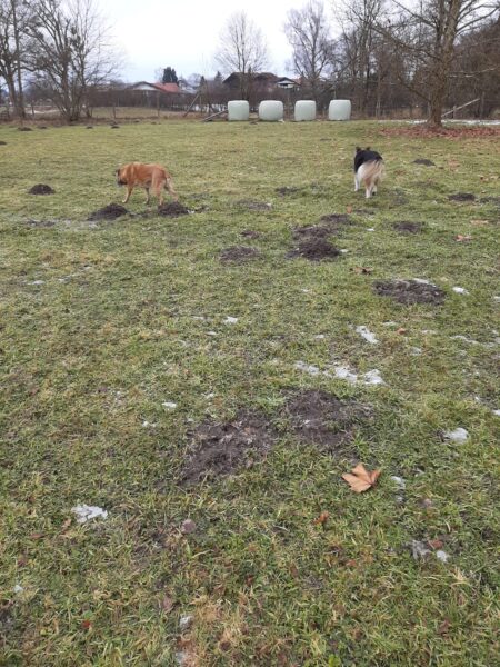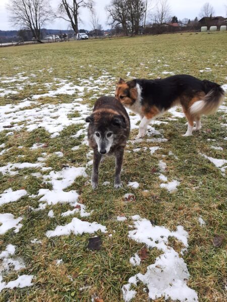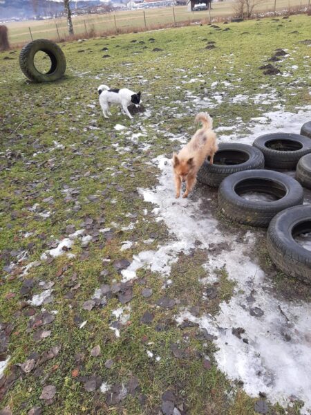 Für Fio, Flora und Grisu ging es gleich im Anschluß mit Fred zum Hundeplatz, wo die drei fröhlich herumtobten. Auch sie waren an den Reifen begeistert bei der Leckerliesuche dabei, danach liefen Flora und Grisu mit den vielen Spaziergängern auf und ab, die auf dem Bachweg unterwegs waren. Fio blieb dem Trubel lieber fern, hielt sich bei Fred auf und ließ sich gerne streicheln. 🙂