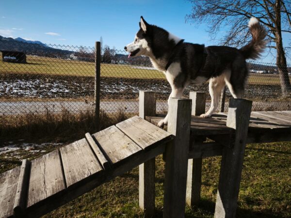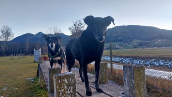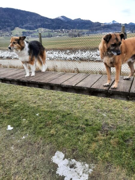 Conny fuhr derweil mit Lena, Angel und Bonnie zum Hundeplatz. Alle vier genossen die Sonne und die gemeinsame Zeit. Lena sauste zwischendurch immer wieder mal zum Krähen scheuchen über den Platz, Angel und Bonnie ließen es ein wenig langsamer angehen, aber auch sie flitzten fröhlich mit Conny zu den Geräten, wo alle drei Hunde einträchtig herumturnten, schnüffelten und nach Leckerlies suchten. 🙂
