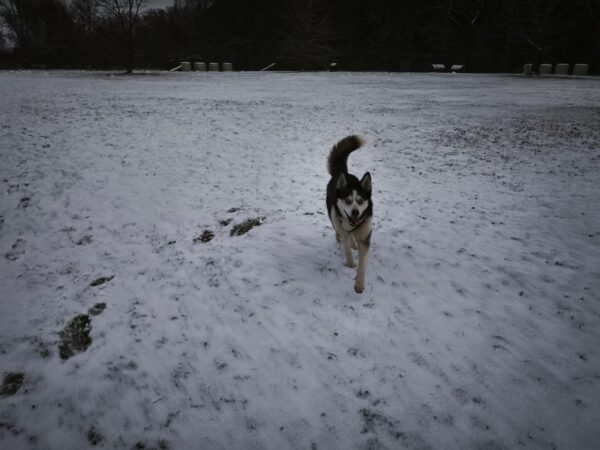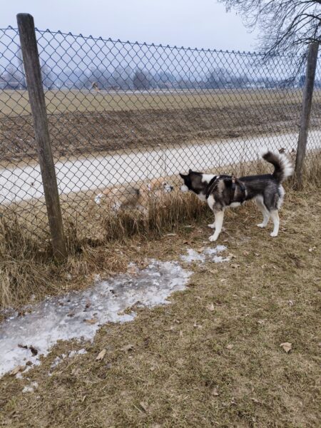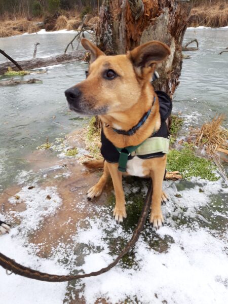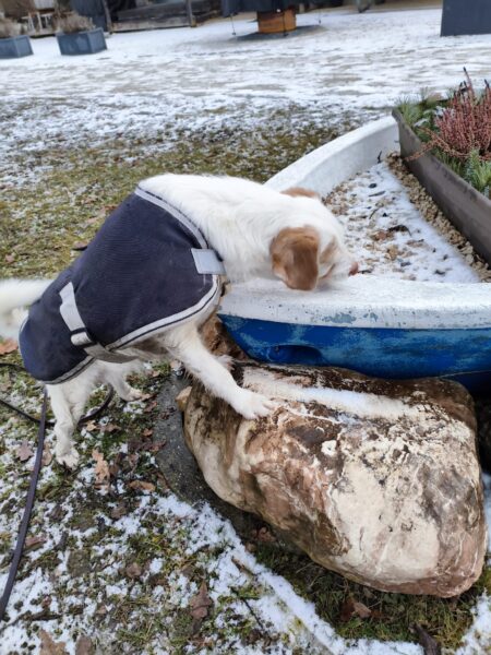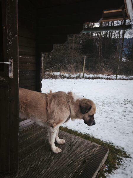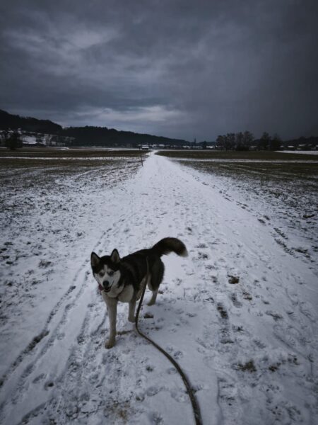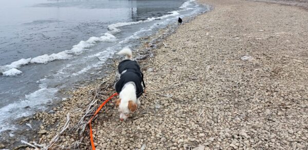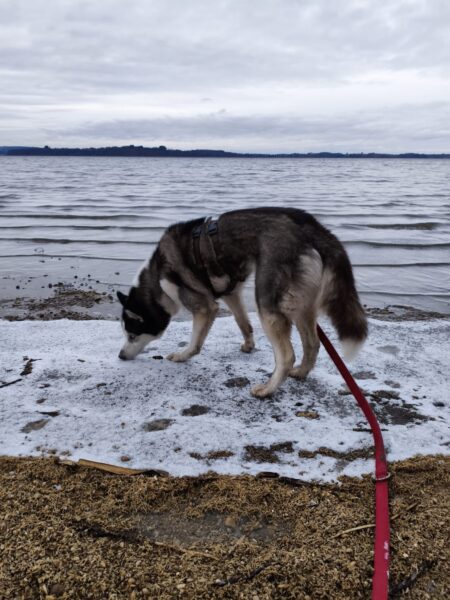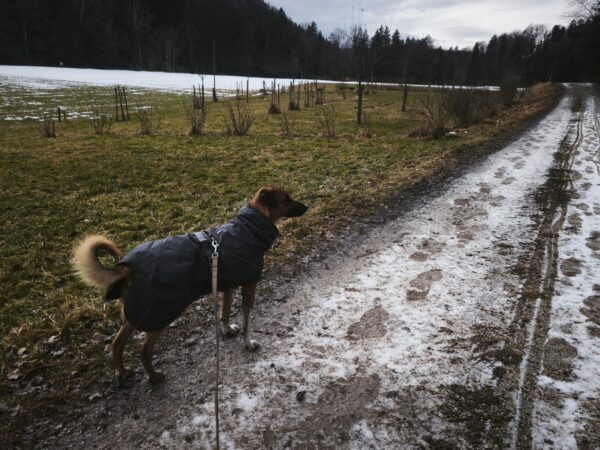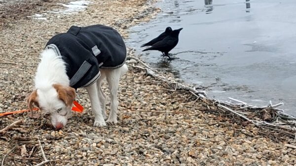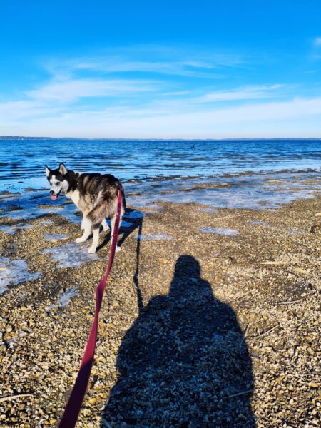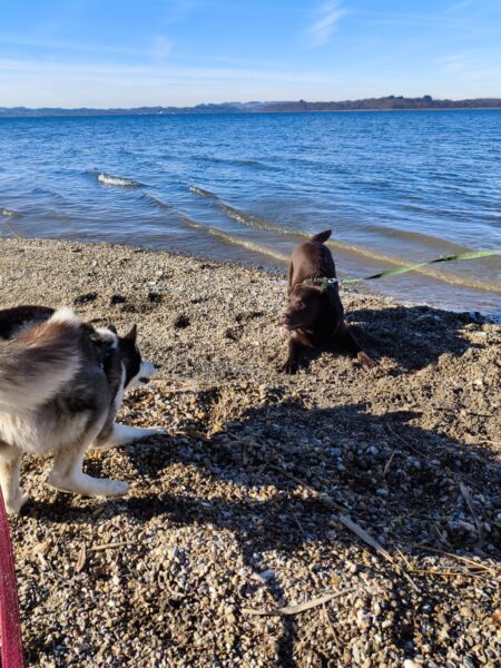 Heinz war mit Kirana lange am Chiemsee unterwegs, was Kirana richtig klasse fand. Unterwegs fand sie immer wieder mal ein paar Schneereste, die sie ausgiebig untersuchte und sich übermütig darin wälzte. Am Strand trafen sie eine Spaziergängerin mit einem Labrador, die Hunde begrüßten sich freundlich und wären am liebsten ordentlich herumgetobt, was aber wegen der Leine nicht so einfach ging und deshalb ging jeder nach einer Weile wieder weiter seiner Wege. 🙂