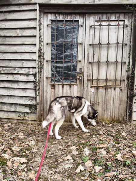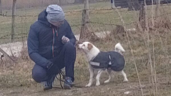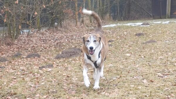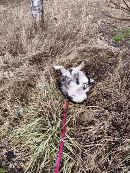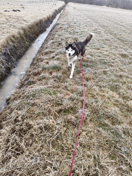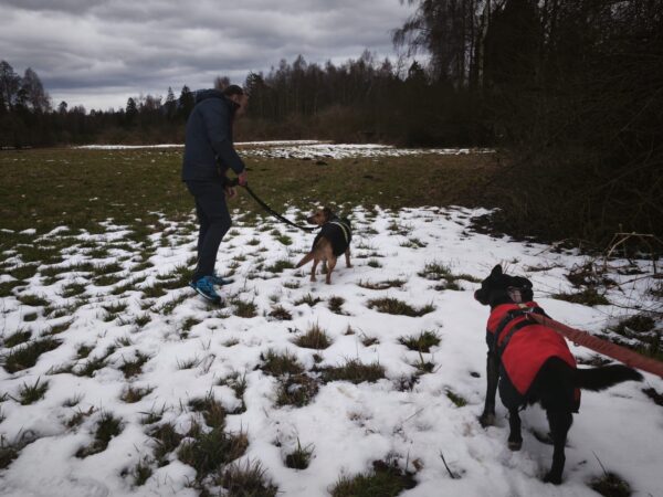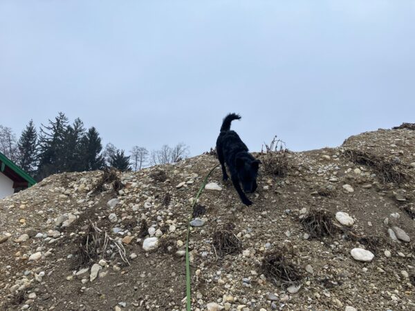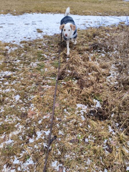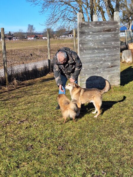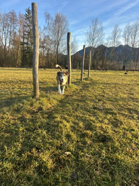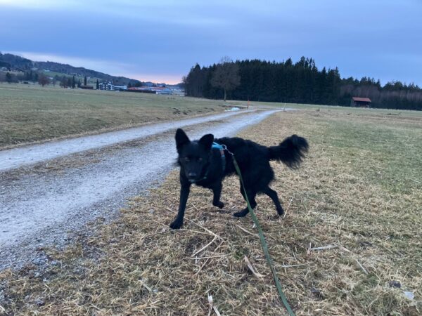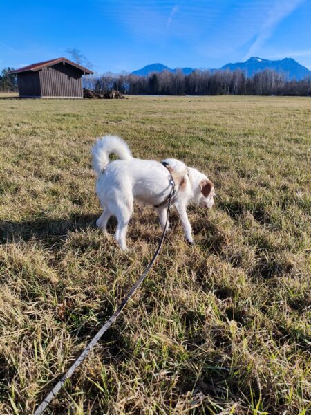 Anna Maria ging derweil mit Sam in Richtung Bernau, dabei machten sie einen Abstecher auf die Wiese schräg gegenüber vom TierHeim. Sam steckte die Nase in viele Mäuselöcher und rannte zwischendurch mit Flitzeattacken an der 10 Meter-Leine. Dabei guckte er immer wieder zu Anna Maria und achtete darauf, dass die Leine locker blieb. Nach einer Leckerliesuche gingen sie zurück ins TierHeim, wo Sam ganz freundlich Kerstin begrüßte, die gerade im Hof war. 🙂