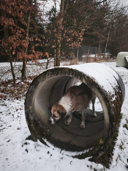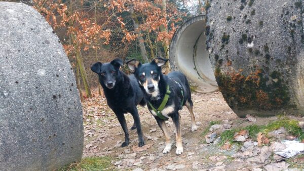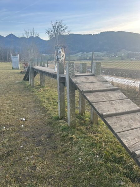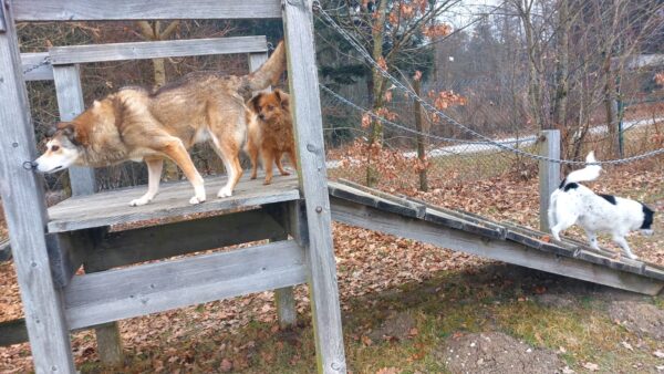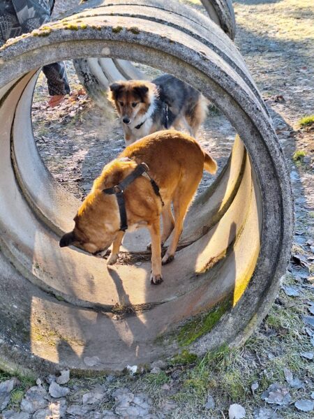 Dagmar und Fred waren mit Rosalie, Lucky und Balto auf dem Hundeplatz, wo alle die herrliche Sonne genossen und viel Spaß hatten, Lucky und Rosalie beim Herumflitzen und Geräteturnen, Balto beim ausgiebigen Schnüffeln. An den Reifen und bei den Betonröhren suchten die drei eifrig nach den ausgelegten Leckerchen und besonders niedlich war, dass Rosalie sich auf der Brücke von Fred lange den Hals und die Brust kraulen ließ. 🙂