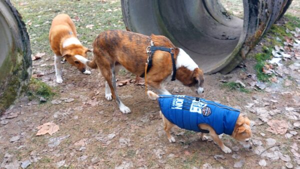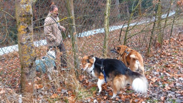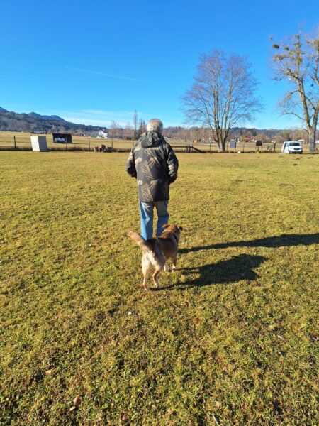 Gleich danach fuhren Dagmar und Fred mit Fio, Flora und Grisu zum Hundeplatz, wo die drei fröhlich schnüffelnd den Platz erkundeten. Nach einer Leckerchensuche bei den Reifen sausten Flora und Grisu zum Zaun und kommentierten vorbeikommende Spaziergänger, Fio lief lieber an Fred´s Seite über das Gelände und ließ sich immer wieder gerne streicheln, der süße Kerl! 🙂