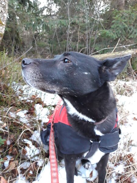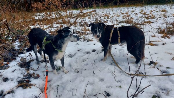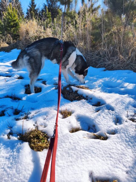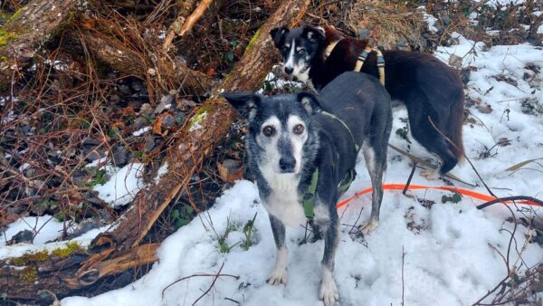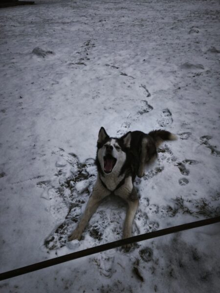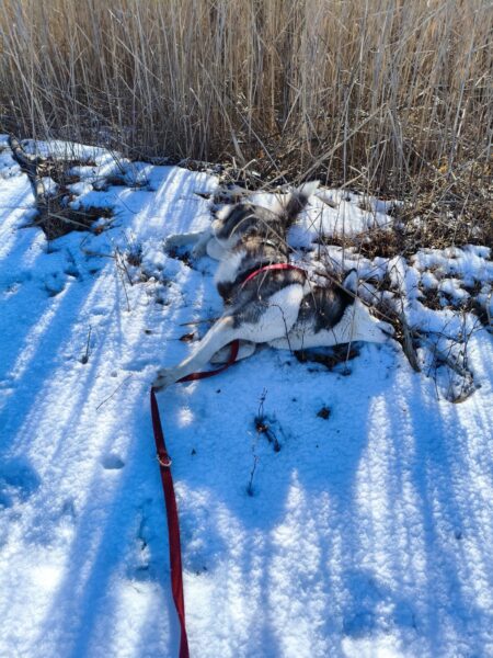 Renate kam am späten Nachmittag und brachte auch Jutta mit, die von Momo und Aika freudig begrüßt wurde. Während Renate mit den Mädels nacheinander einen schönen Spaziergang zur großen Wiese und zum kleinen See dahinter machte, blieb Jutta zum Kuscheln, so daß keine der beiden Mädels alleine bleiben musste. 🙂 Aika freute sich über die Schneereste und wälzte sich darin. Momo zog es mehr in den Wald, wo sie sehr genau die Spuren verfolgte. Leckerchen und Kuschelpausen gab natürlich auch für beide. 🙂