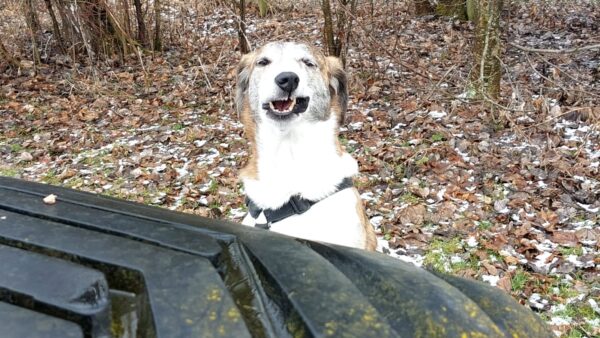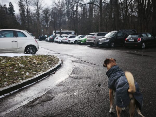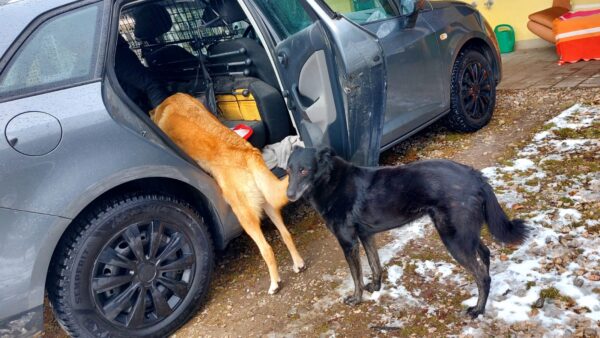 Mittags machte Alex mit Percy Autotraining, denn es ist einfach so schade, dass er sich gar nicht mehr in ein Auto traut. Alex machte beide Seitentüren und die Heckklappe auf, das Ziel war erst einmal, dass Percy gerne im Auto ist und sich darin sicher fühlt. Das klappte auch gut, Percy kam zu Alex ins Auto, freute sich über Leckerlies und ließ sich lange streicheln, alles in entspannter Stimmung. Nicky und Laluna waren natürlich auch dabei, sie gingen mal mit ins Auto, mal schnüffelten sie über den Hof und natürlich gab es auch für die Mädels Leckerchen. Als Alex nach einer Weile die Heckklappe schloss, war es für Percy immer noch ok, erst, als sie auch noch eine Tür zumachte, wurde er unsicher und sprang hinaus. Das war aber ok, Alex machte nochmal alle Türen auf, Percy kam wieder zu ihr rein und nach einer Weile streicheln stieg Alex aus und erklärte das Training in guter Stimmung für beendet. Nach einer Weile im Hof brachte sie die drei zurück in ihr Zimmer. 🙂