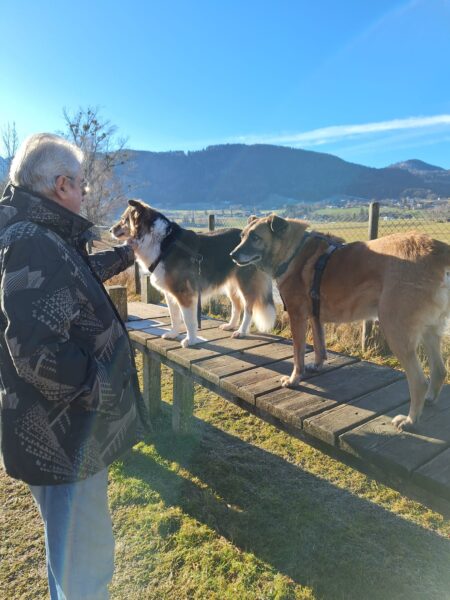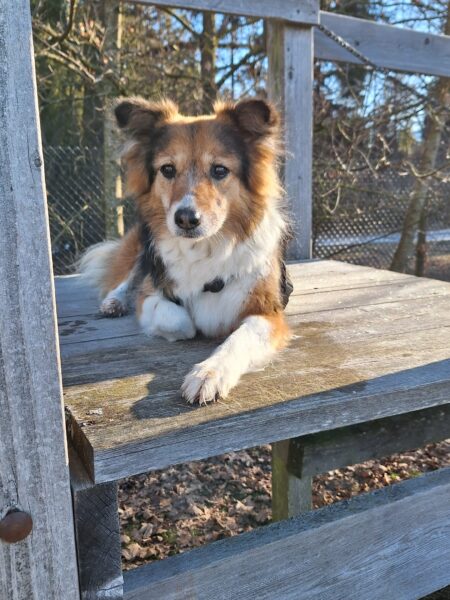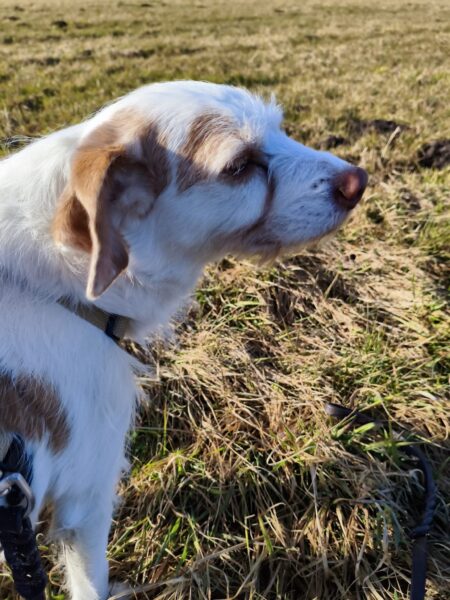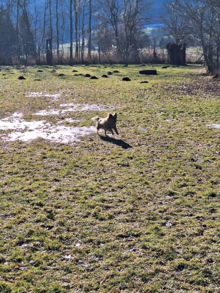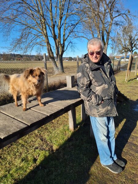 Danach freute sich Elfie über einen Spaziergang mit Heinz. Sie waren auf den Wiesen beim Waldweg unterwegs, wo Elfie ihrer Schnüffelleidenschaft nachging und zu ihrer Freude auch das ein oder andere Leckerlie im Gras fand. Zwischendurch genossen die beiden schöne entspannte Kuschelmomente in der Sonne. 🙂