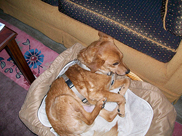 Anbei senden wir ein Bild von Brownie. Es zeigt auch seine rumänische Hundefreundin Beibi und David. Beide sind enge Familiemitglieder. Im Sommer geniessen sie des öfteren das Ostseeklima zusammen, wobei Beibi die Hasen jagen möchte, Brownie aber ganz entspannt nur zusieht.