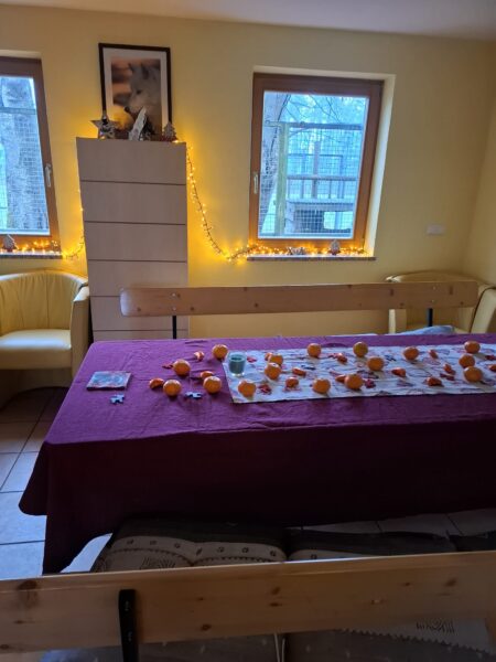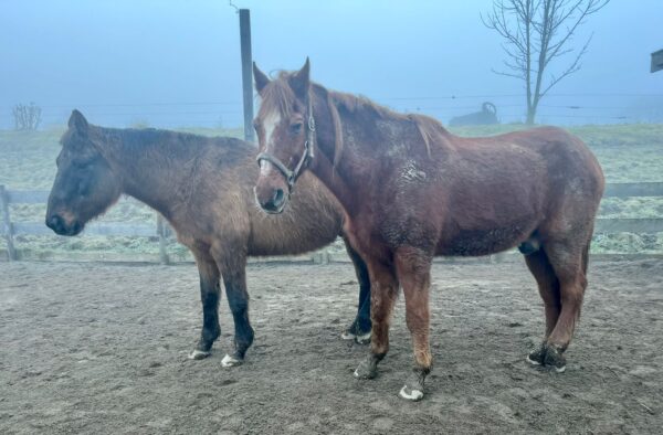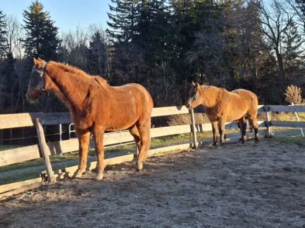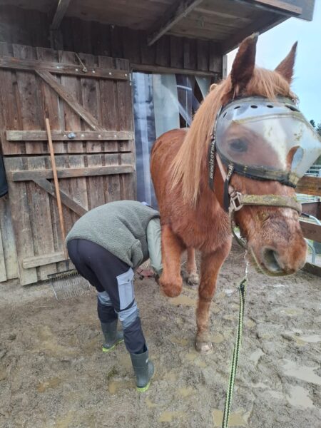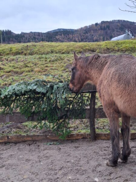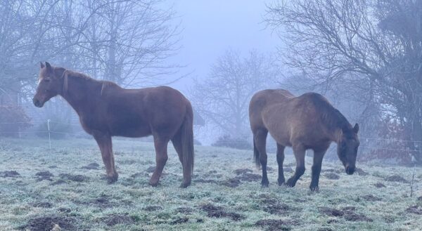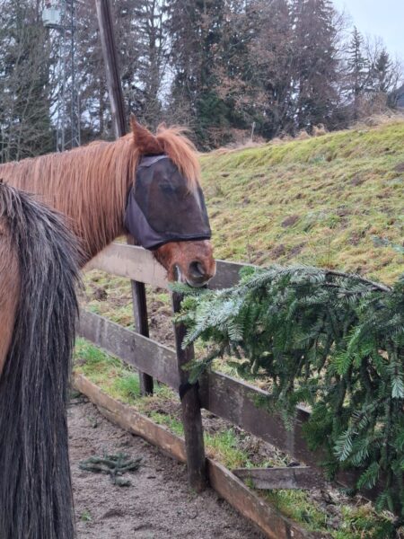 Morgens war Anna Maria bei den Pferden, die sich schon auf ihr Müsli freuten. Bei der anschließenden Fell- und Hufpflege waren beiden sehr kooperativ und ließen sich brav versorgen. Nachdem Anna Maria die üblichen Stallarbeiten erledigt hatte, ging sie zu den Jungs auf die Weide und verabschiedete sich mit einem Leckerlie von ihnen. 🙂